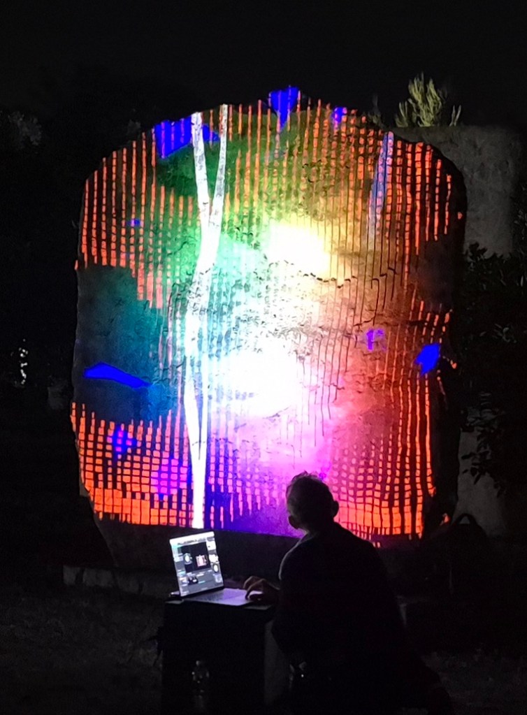 Returning to Europe, the artists realized the installation Layers of Reality in the absolute center of Mediterranean Sea, around the archeological site of Pozzo Santa Cristina, in Sardinia: a digital projection on a prehistoric basalt rock at Sciola Foundation’s Sound Garden: a superposition of realities, working with the same visual coloring methods that are used by Alma astrophysicists when revealing fields of planet formation.