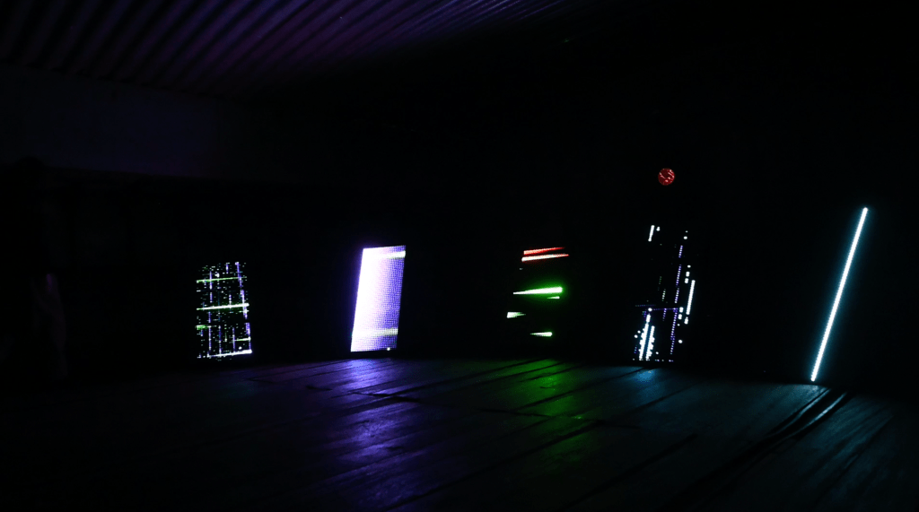 The extremely intense, low and spaced resolution of the monitors makes visible each single light pulse. The screens revealing traces of detected realities. The sound installation is composed with cosmic captures by “Alma-sounds” astrophysical platform, particles of planet genesis.